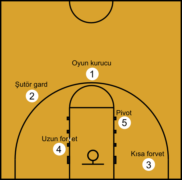 Her takım sahada beş oyuncu ile oynar ve yedeklerle birlikte kadro genellikle on iki kişiden oluşur. Oyuncular sahada oyun kurucuşutör gardkısa forvetuzun forvet ve pivot pozisyonlarında görev alır. Bu pozisyonlar, oyuncuların hücum ve savunmadaki rollerini belirler.