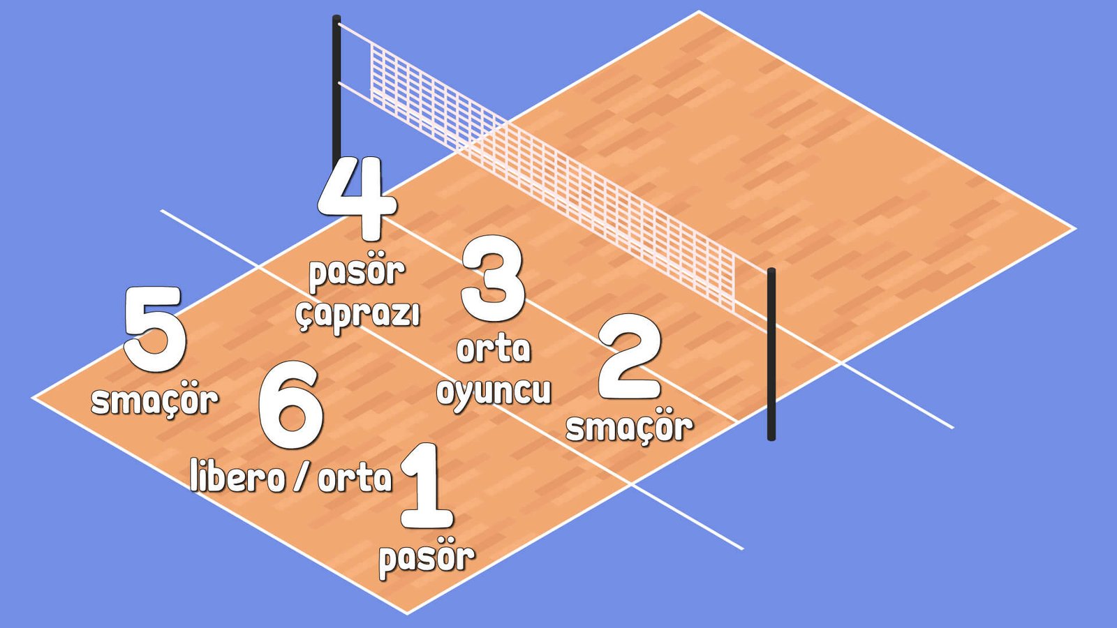 File yüksekliği, erkeklerde 2,43 m; kadınlarda ise 2,24 m’dir. Hücum çizgisi yani 3 metre çizgisi ön ve arka hattı birbirinden ayıran çizgidir.